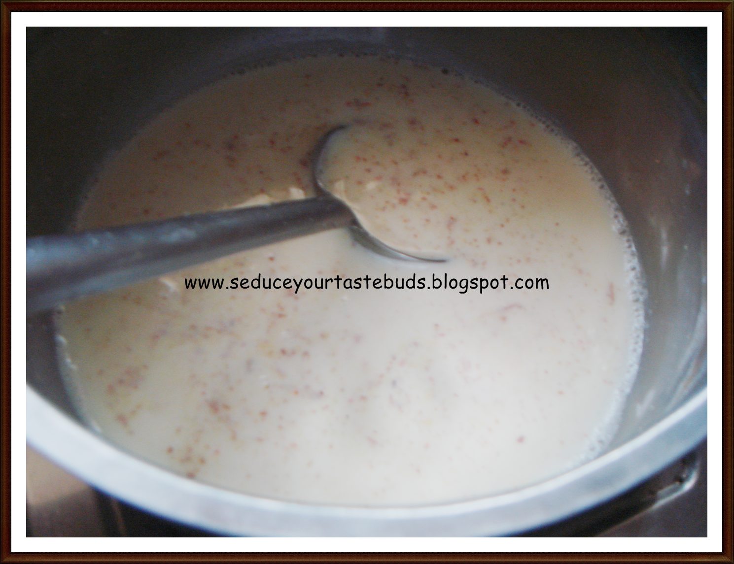 14.The paneer will be double the original size now.15.Heat the 3/4 liter milk in a heavy bottomed vessel and add the remaining sugar, nuts, saffron, cardamom and simmer till it reduces to 3/4th of the original quantity.